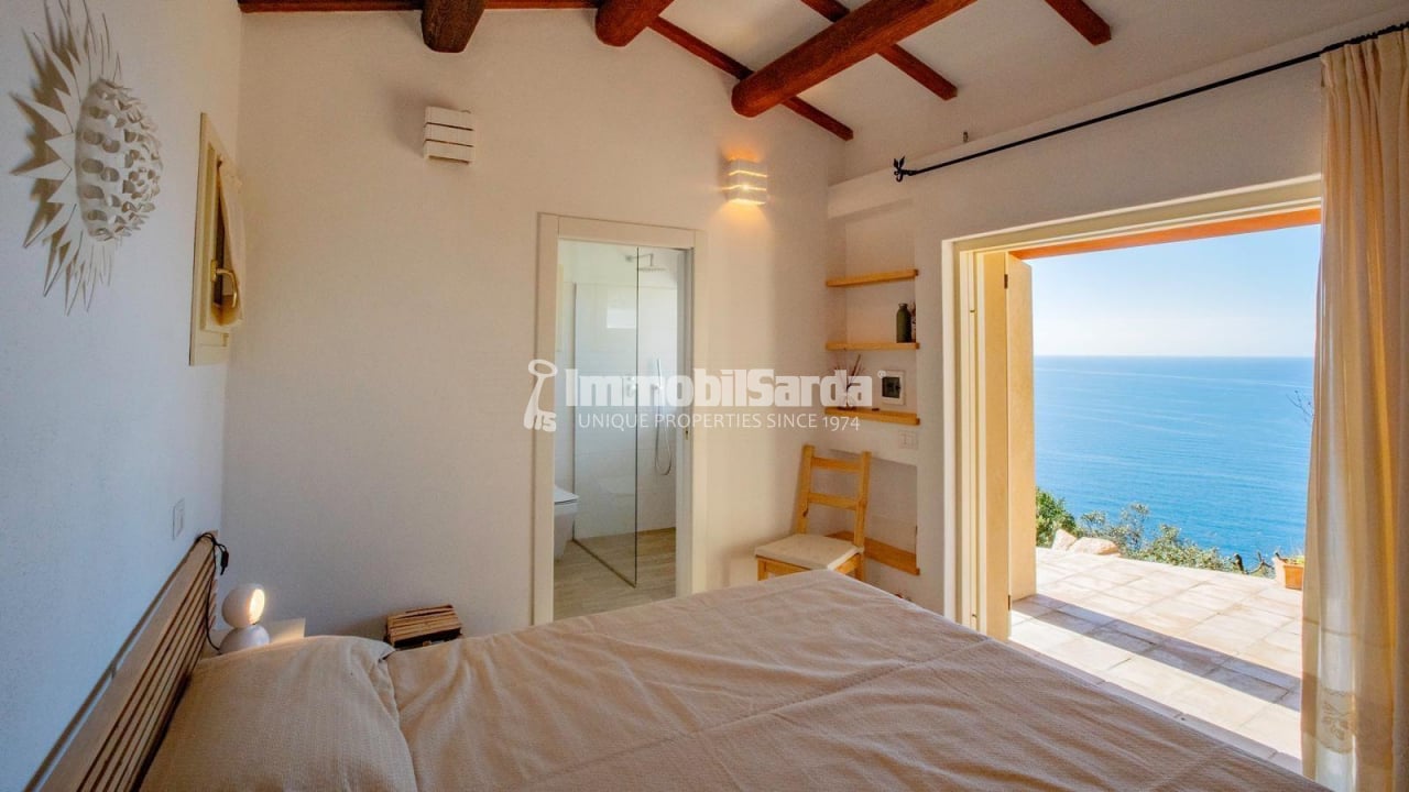 The main house, designed by Ponis, features a bright living area with large windows overlooking the sea, an open-space kitchen, and two double bedrooms, each with its own en-suite bathroom. One of the bedrooms also includes a spacious walk-in wardrobe.