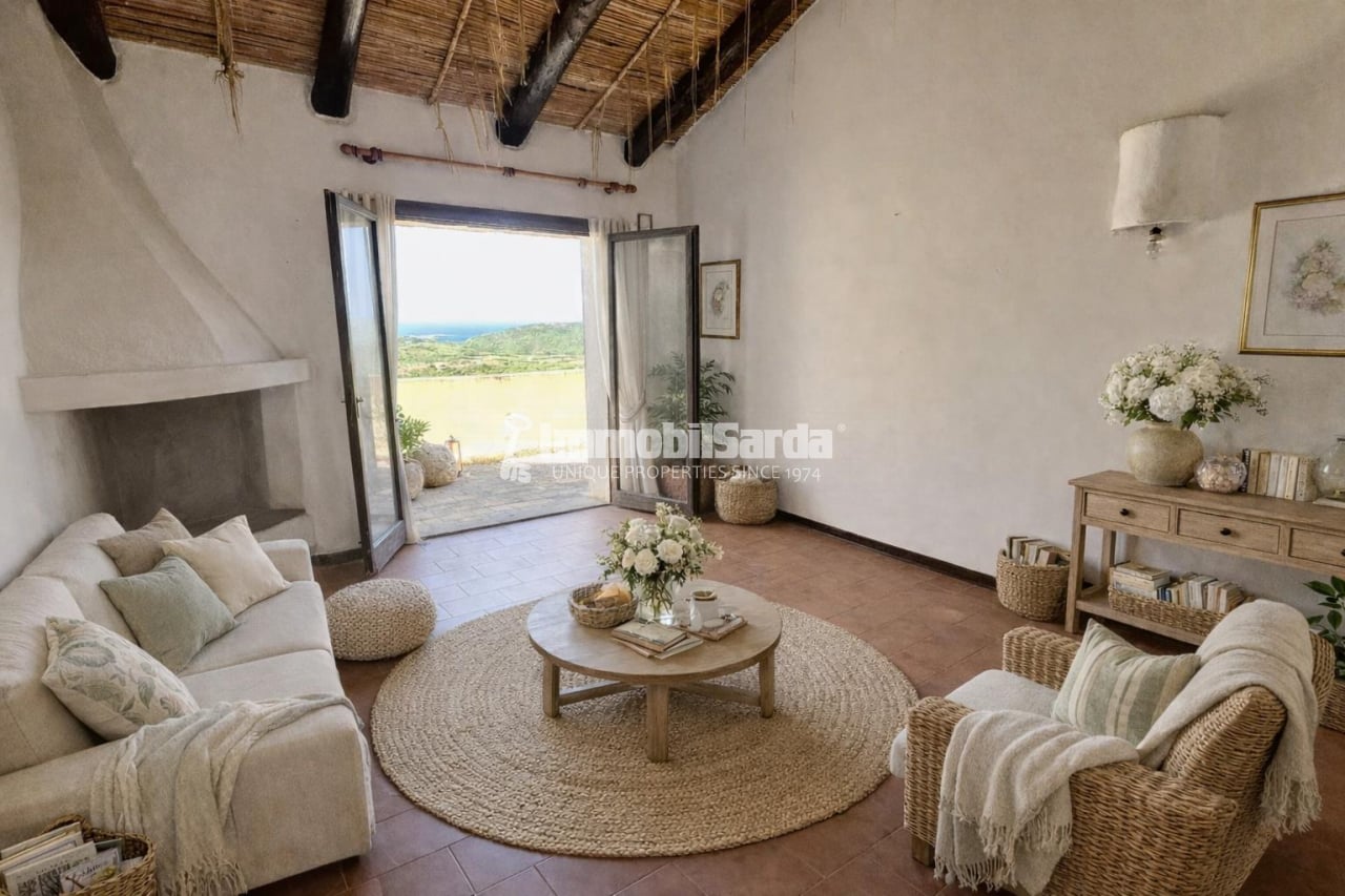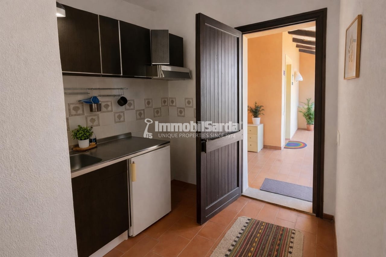 The apartment occupies the first and top floor of a small, building with neutral-toned exterior finishes that blend seamlessly with the surrounding vegetation. The front door opens into a small hallway that distributes access to the various rooms: on the right, you’ll find the kitchenette, practical and trimmed with traditional-style tiles; continuing straight ahead leads you into the living room. Here, a fireplace and a ceiling of exposed wooden beams and reed matting lend a characteristic, welcoming touch that evokes Sardinian tradition. The living area opens onto the private terrace—an ideal spot for al fresco meals or relaxing moments while enjoying the green landscape and the distant view of La Marmorata’s sea.